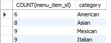 SELECT COUNT(menu_item_id), category